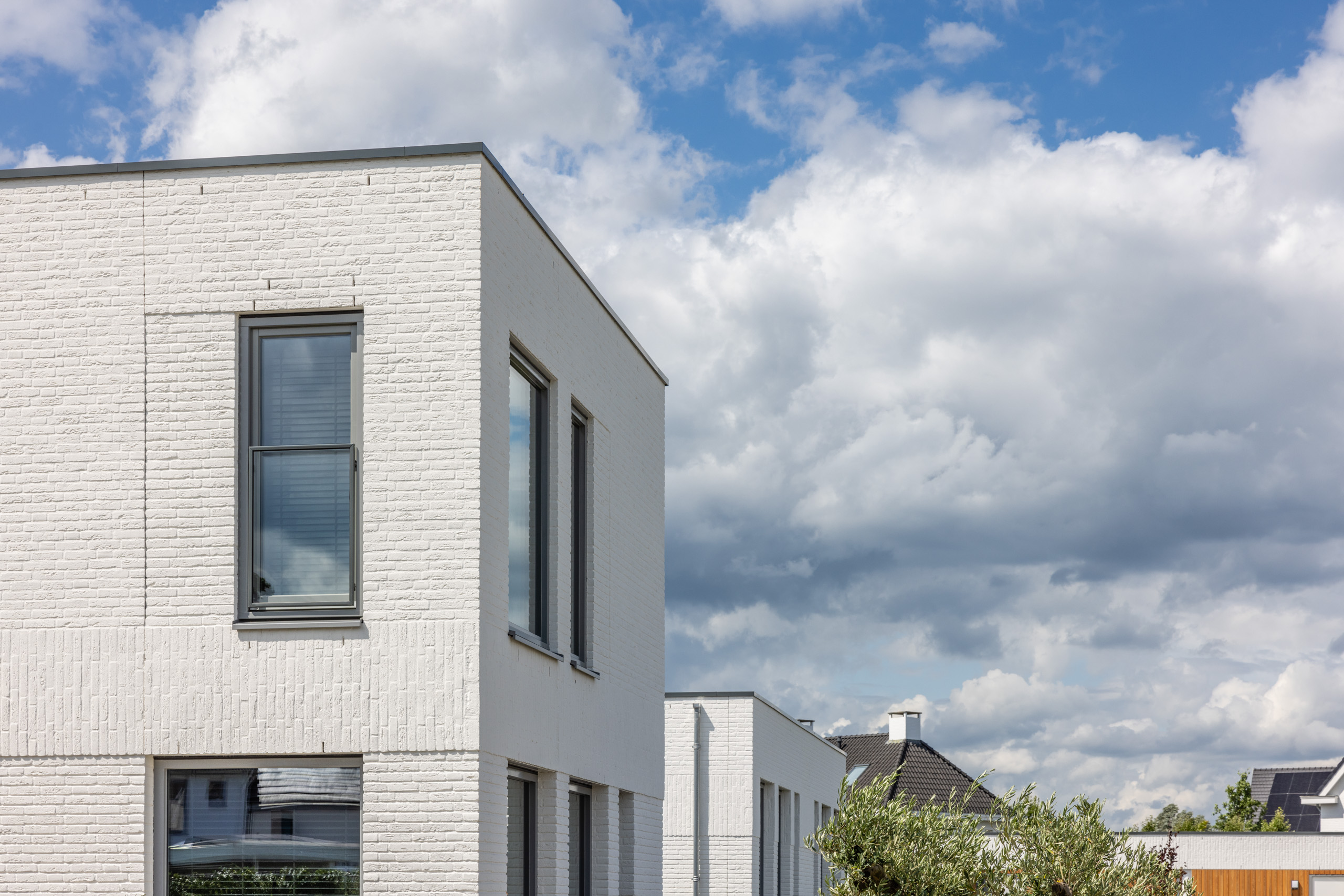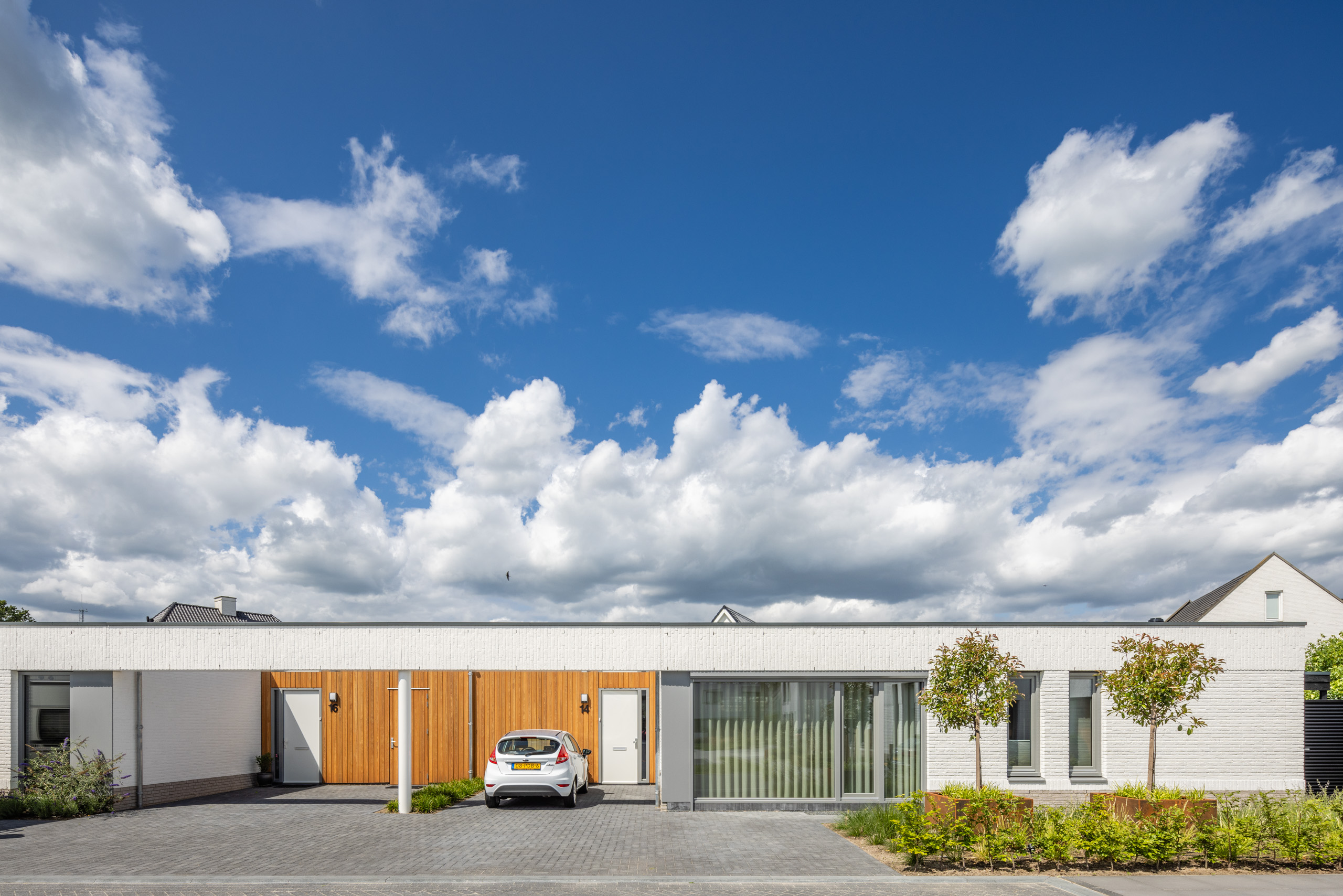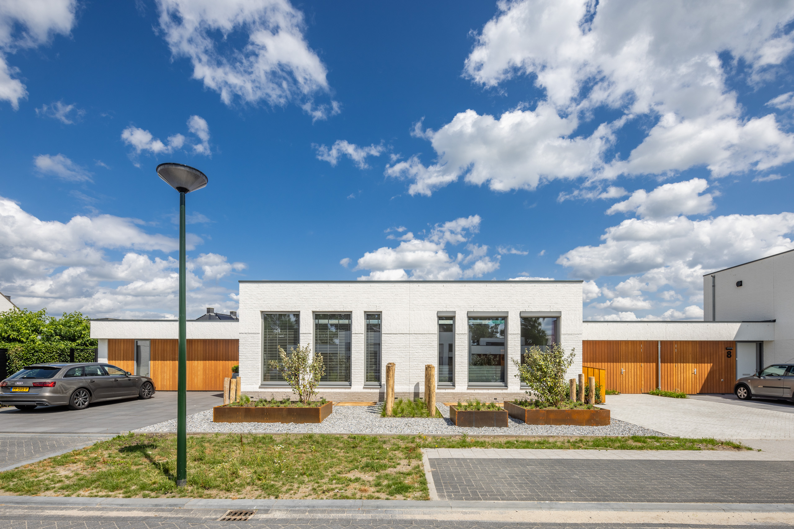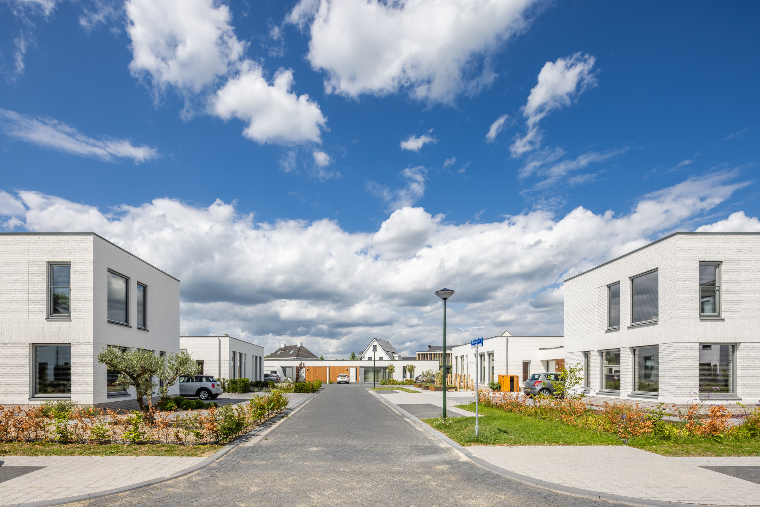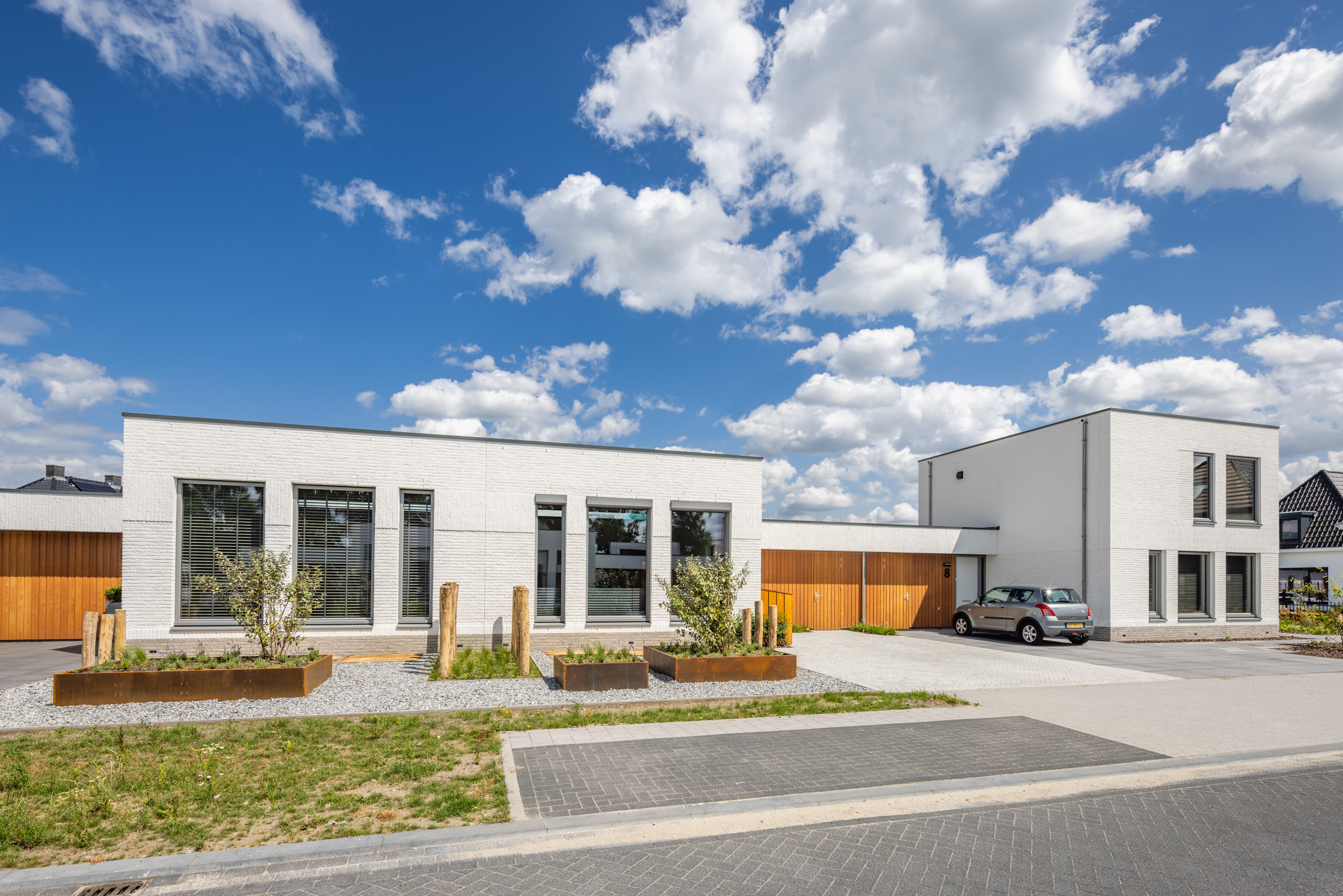 De 8 woningen vormen samen een prettig cluster. De 2 woningen aan de kop van de straat hebben een verdieping gekregen, waardoor een krachtige identiteit van het wooncluster ontstaat. Hierdoor ontstaat bij binnentreden van het gebied een binnenterrein met een verfijnd en ingetogen karakter.