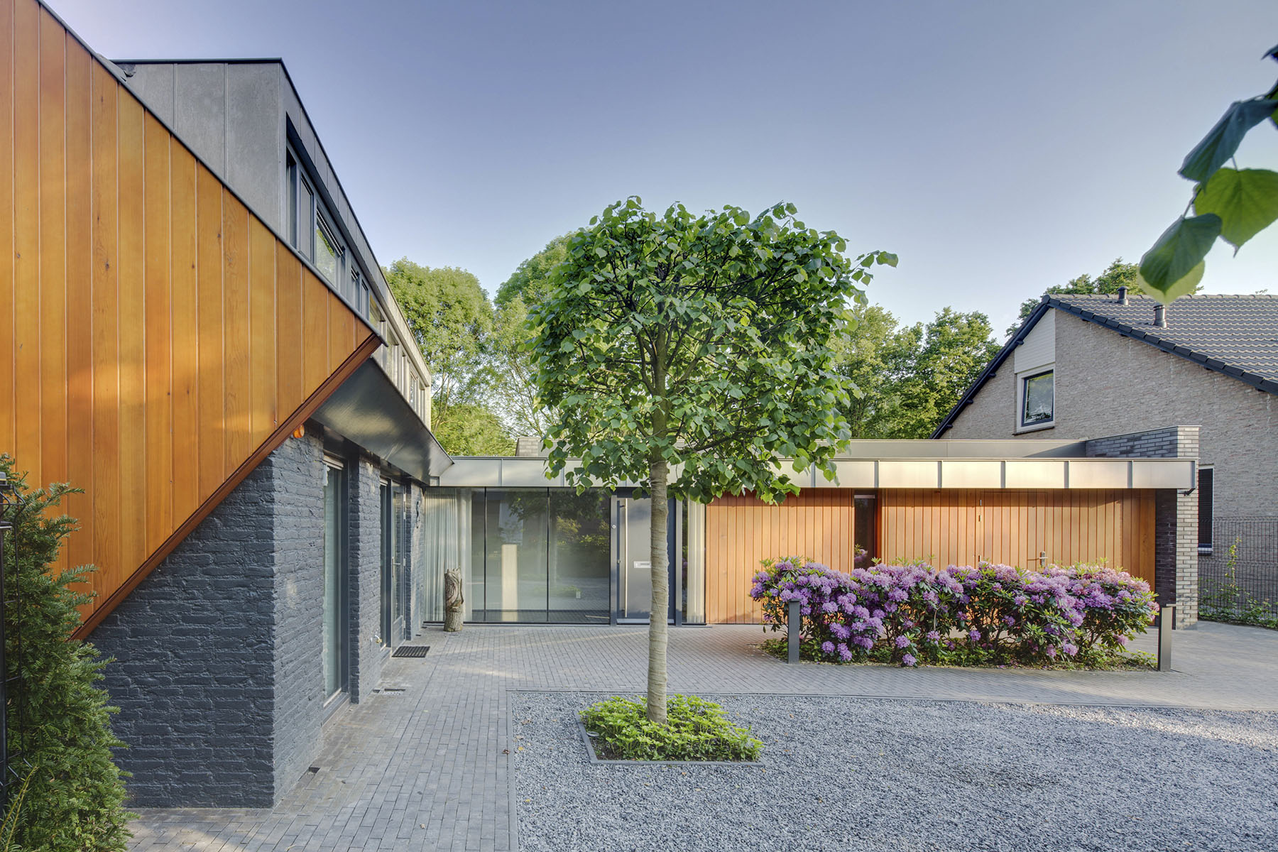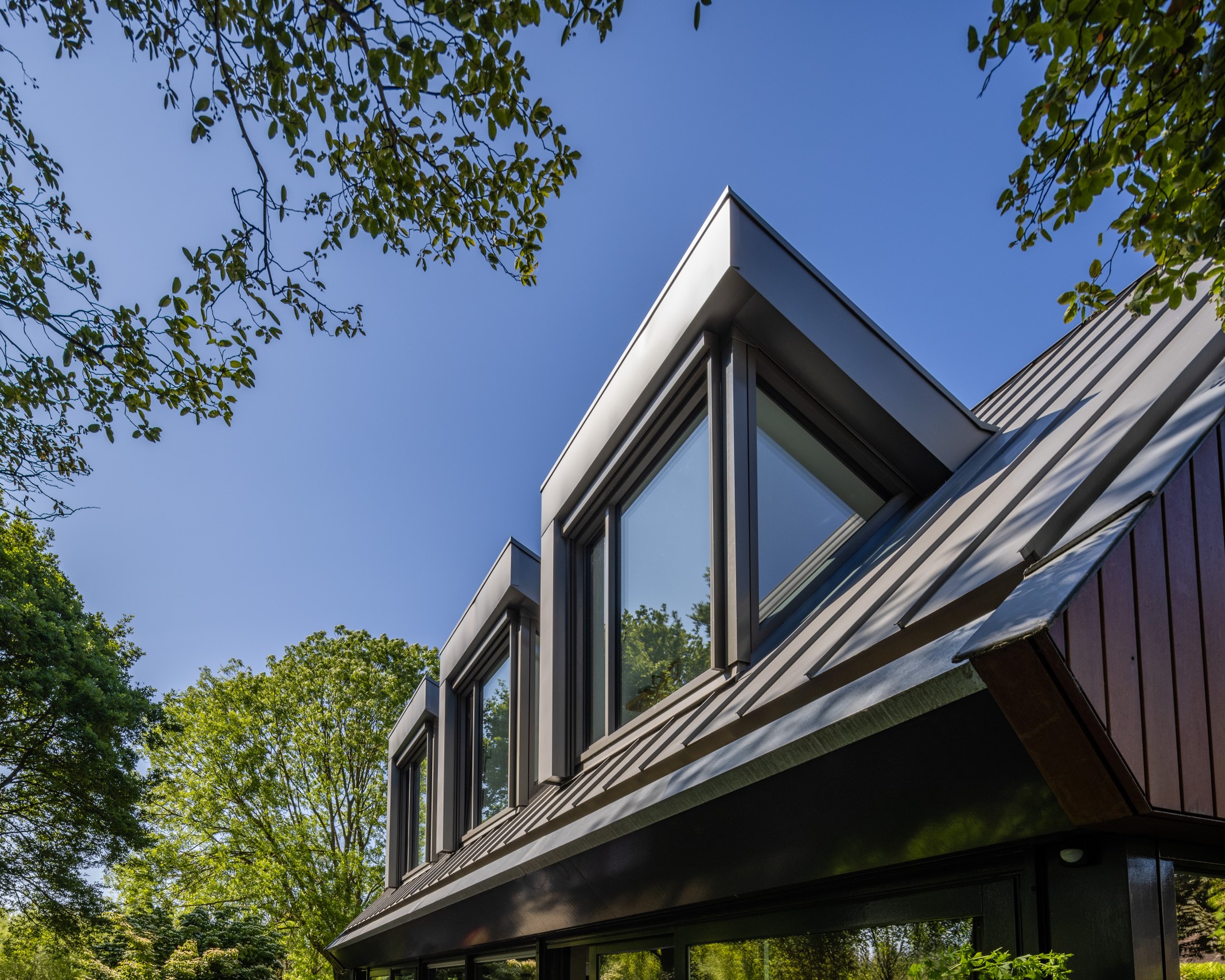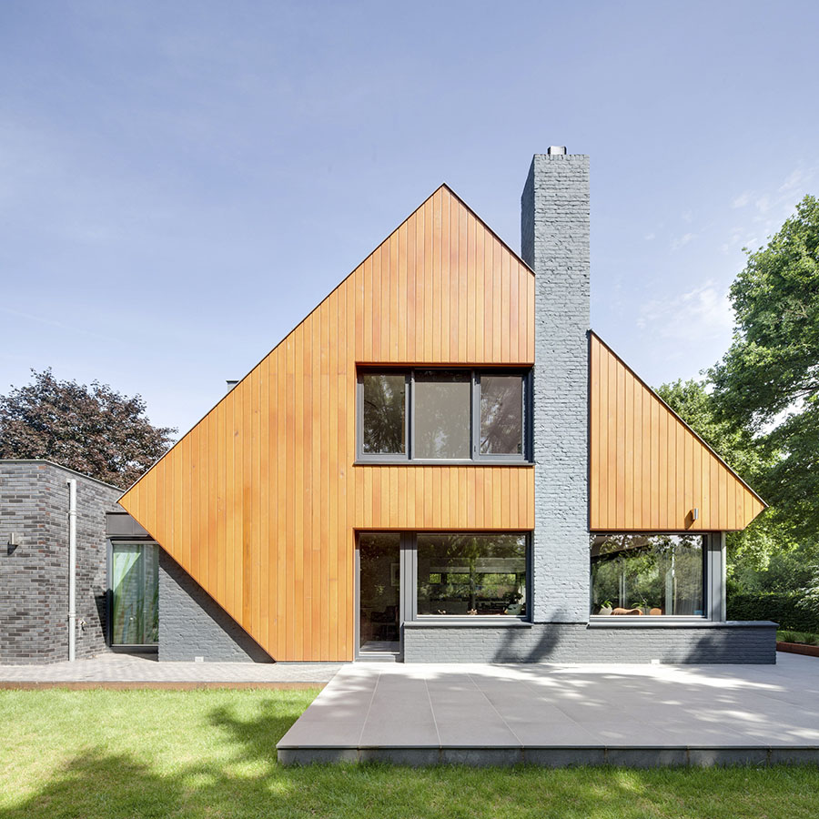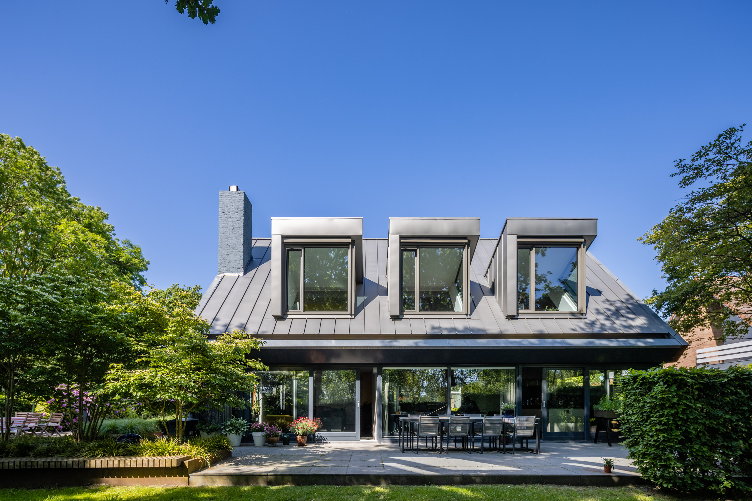 10 jaar later was het tijd voor een tweede facelift. Dit keer was het tijd om de zolder aan te pakken. De toevoeging van een zinken dak met uitgesproken, extraverte dakkappelen geven dit gebouw een directe relatie met de tuin en het aangrenzende dommeldal. De materiaal -en kleurkeuze zorgen er dan weer voor dat het dak en uitbouw zich één geheel vormt met de glazen pui op de begane grond.