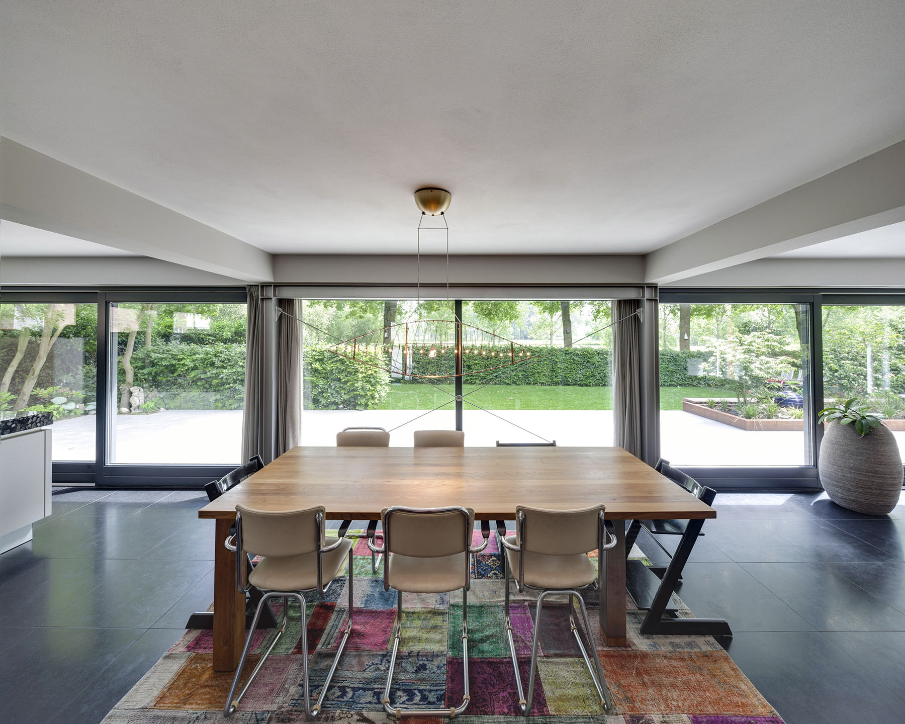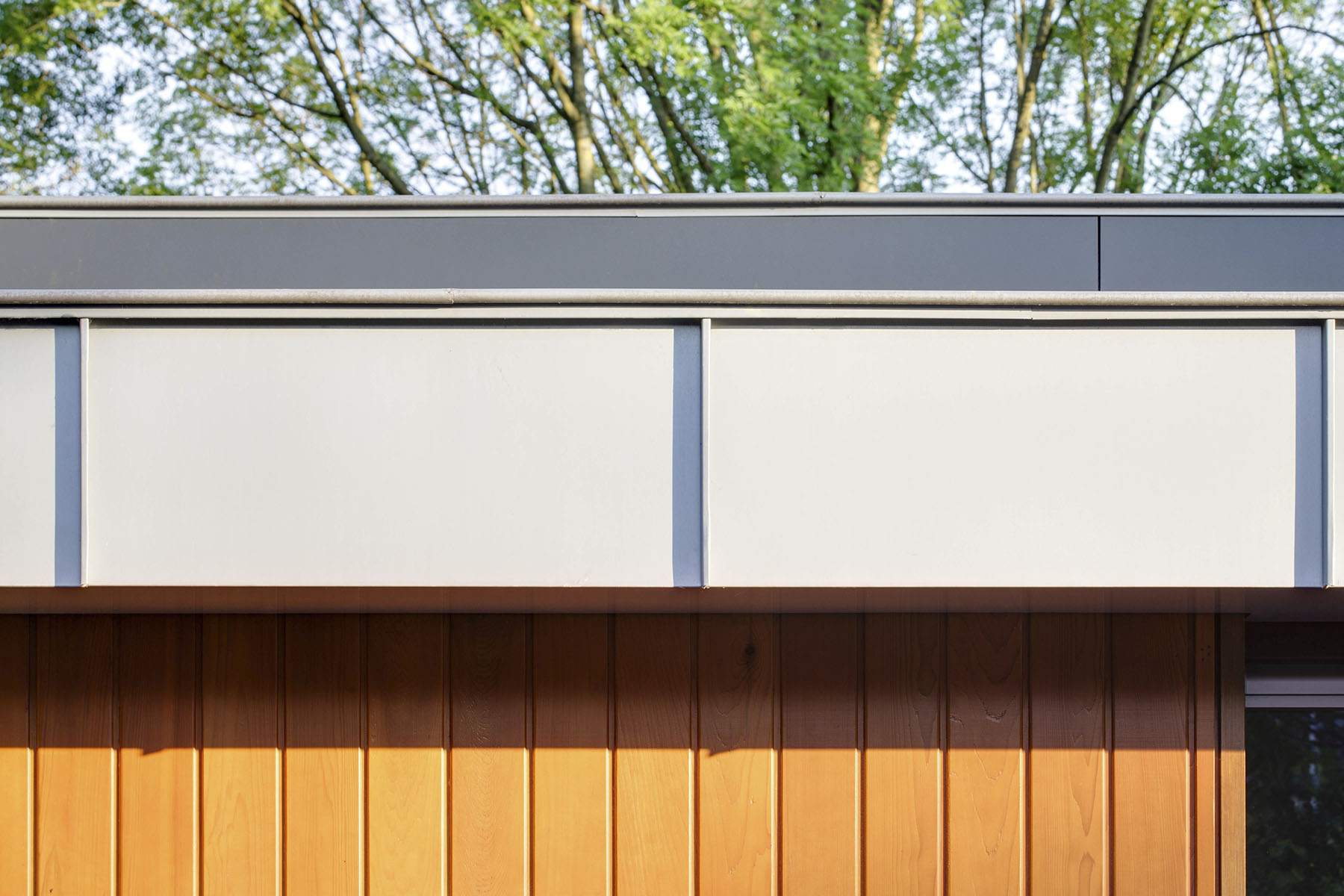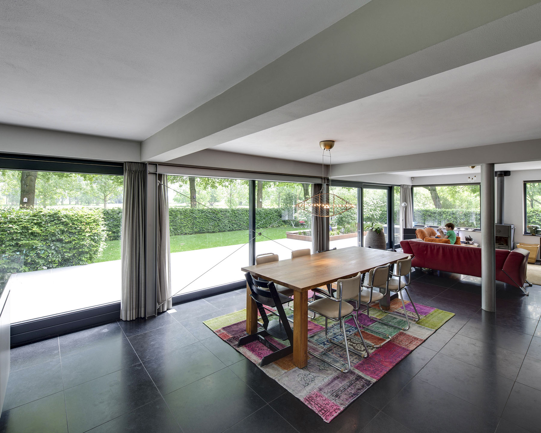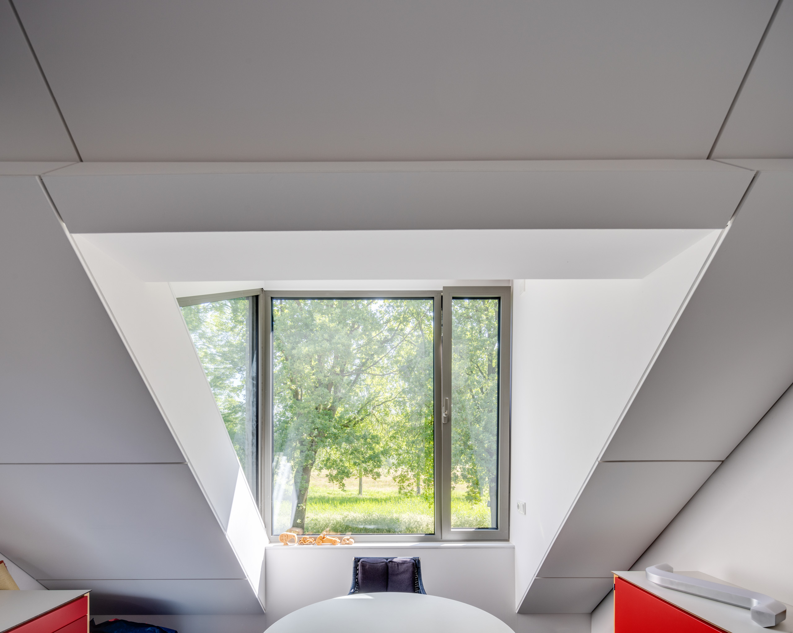 10 jaar later was het tijd voor een tweede facelift. Dit keer was het tijd om de zolder aan te pakken. De toevoeging van een zinken dak met uitgesproken, extraverte dakkappelen geven dit gebouw een directe relatie met de tuin en het aangrenzende dommeldal. De materiaal -en kleurkeuze zorgen er dan weer voor dat het dak en uitbouw zich één geheel vormt met de glazen pui op de begane grond.